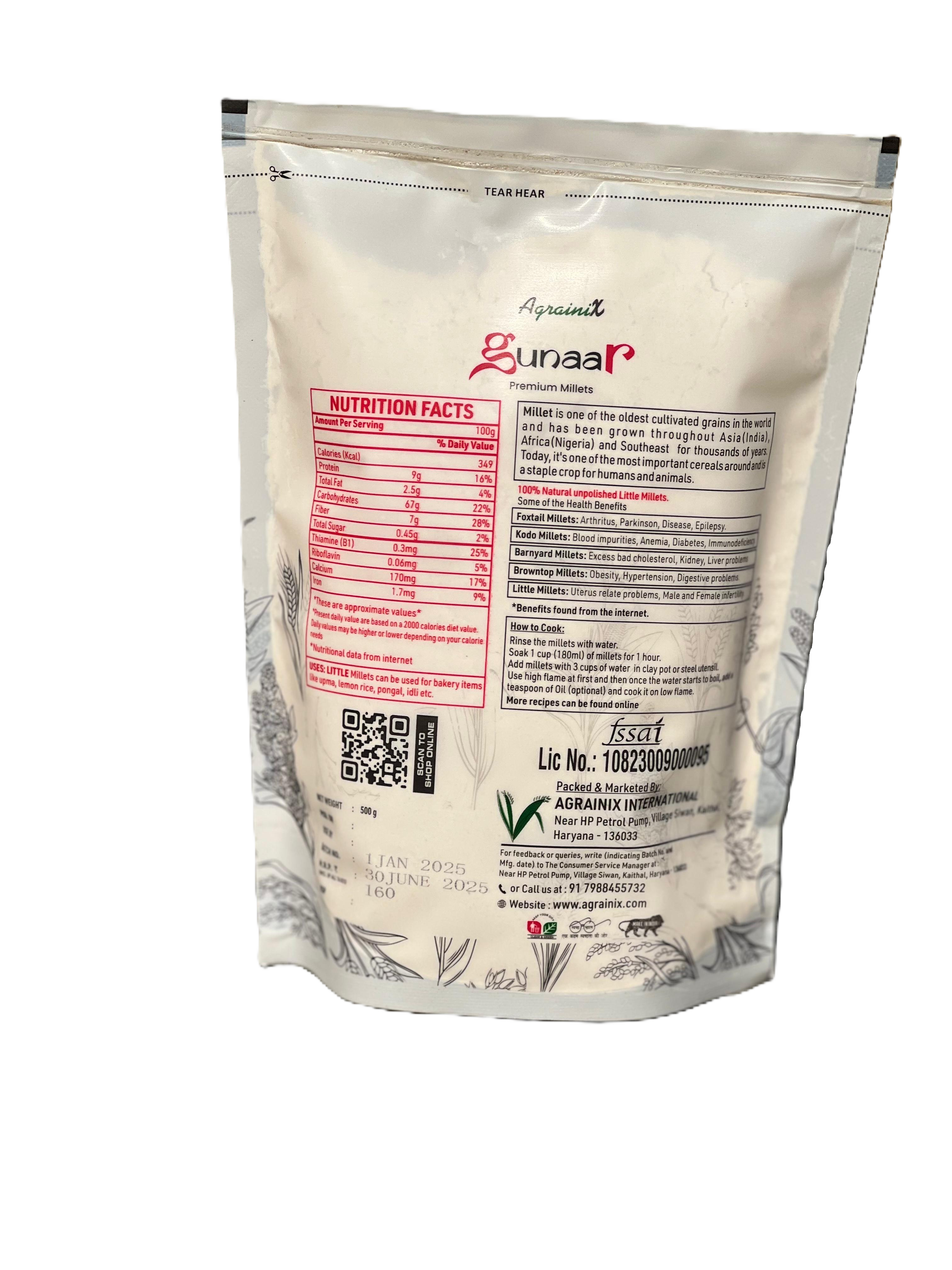 Little Millet (Panicum Sumatrense) is a quick growing, short duration cereal which can withstand both drought and water logging. It is an important crop grown for food and feed. It was domesticated in the Eastern Ghats of India occupying a major portion of diet amongst the tribal people and spread to Sri Lanka, Nepal, and Myanmar. In India, its cultivation is mostly confined to the the tribal belt of Madhya Pradesh, Chattisgarh and Andhra Pradesh. It is wonderful millet which is suitable for people of all age groups. It helps to prevent constipation & heals all the problems related to stomach. Little millet is rich in cholesterol, when consumed increases good cholesterol in the body, suitable for growing kids and strengthens the body. Its complex carbohydrate digests slowly which is very helpful for diabetic patients.